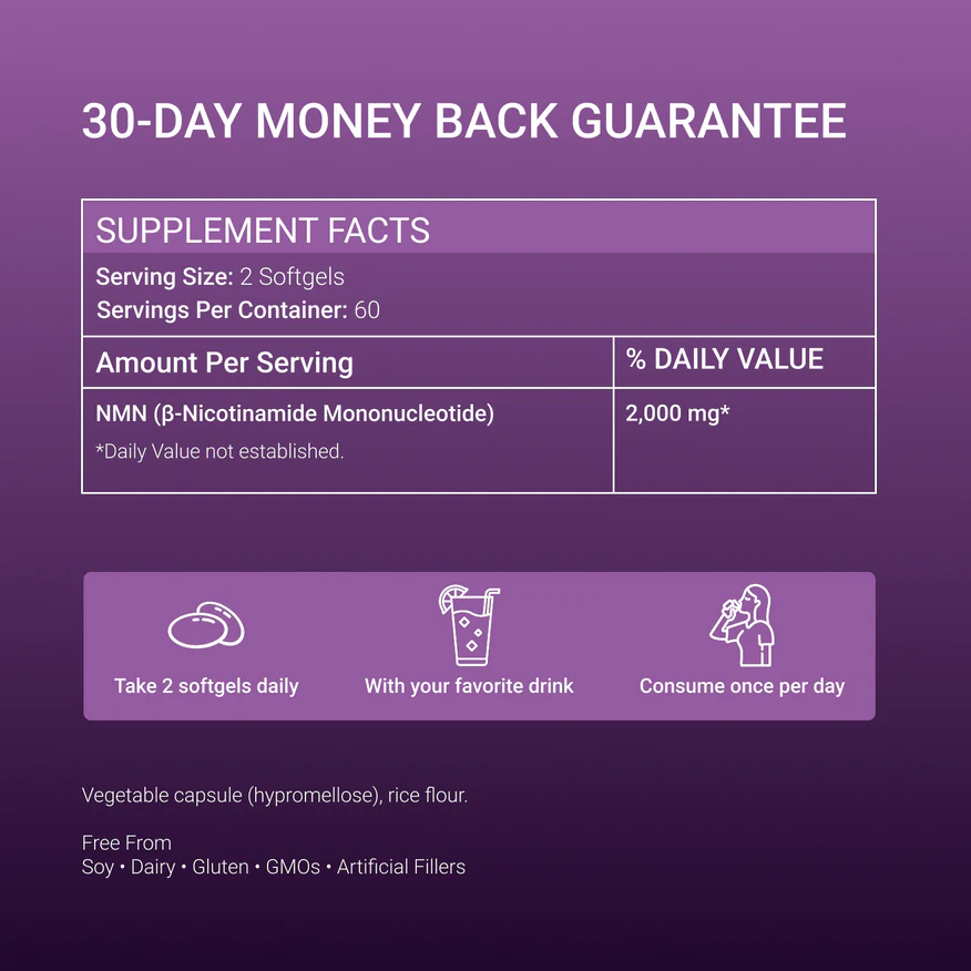 NMN (Nicotinamide Mononucleotide) is a direct precursor to NAD+ — the essential coenzyme your body uses to produce cellular energy, support metabolism, and maintain healthy aging processes. Taking NMN daily helps your body maintain the NAD+ levels it needs to function at its best.
