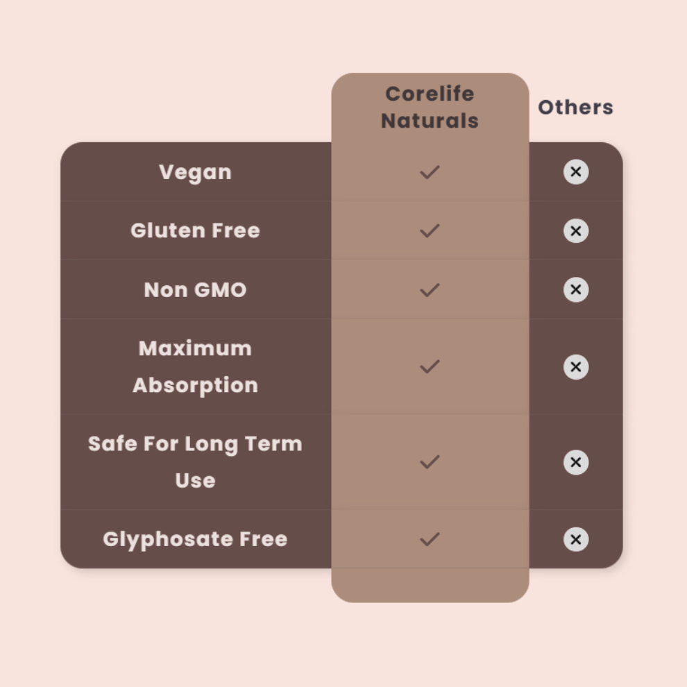 Our formula is made with your long-term wellbeing in mind. Each ingredient is carefully selected to meet the highest standards — plant-based, gentle on the gut, and completely free from gluten, GMOs, and glyphosate.